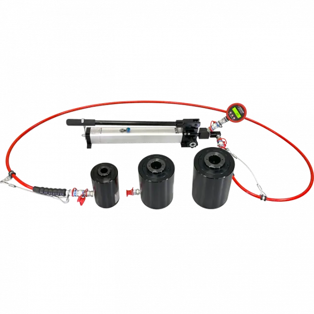 Sættet består af en hulboringscylinder i aluminium, en to-trins håndpumpe med swivel-blok og lavt pumpe-modstandsmoment, et aftageligt, genopladeligt digitalt manometer samt en 3 m hydraulikslange med integreret slangesikring.